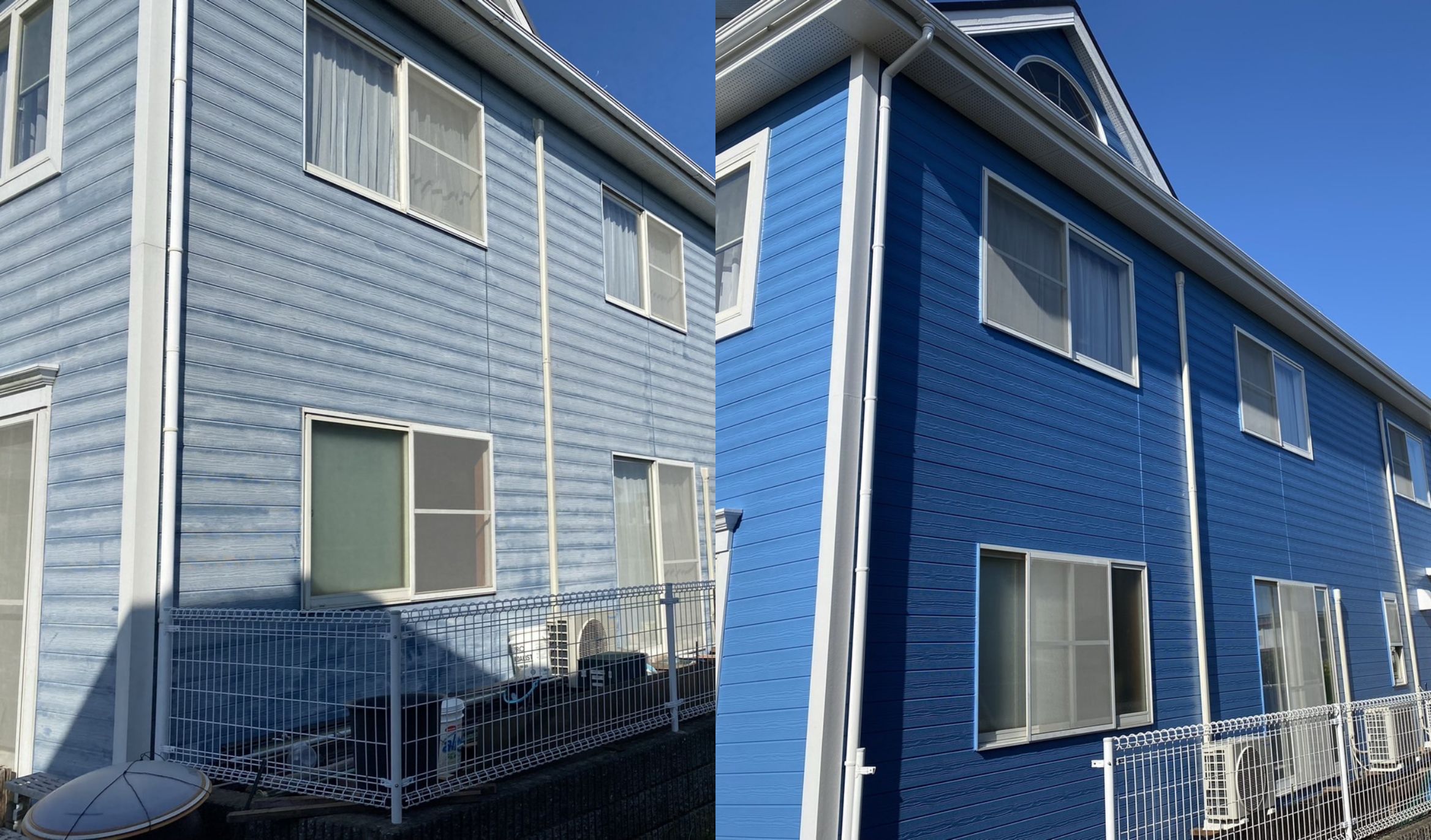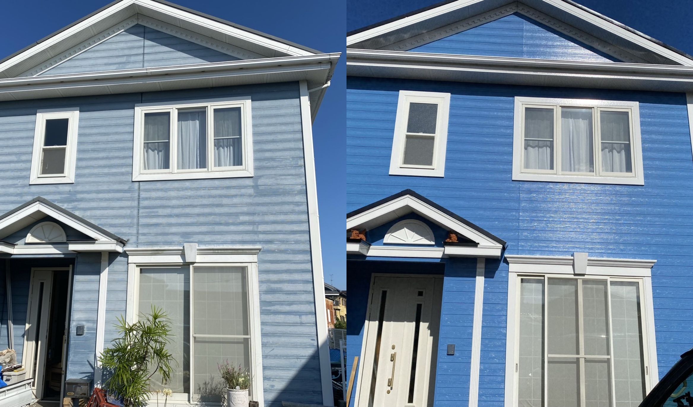 外壁は本来の鮮やかな青色に、屋根も元の綺麗な状態に戻り、新築のようだと大変喜んでいただけました。